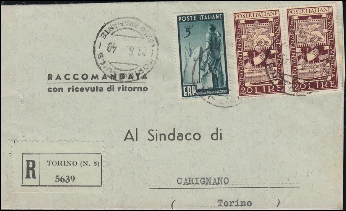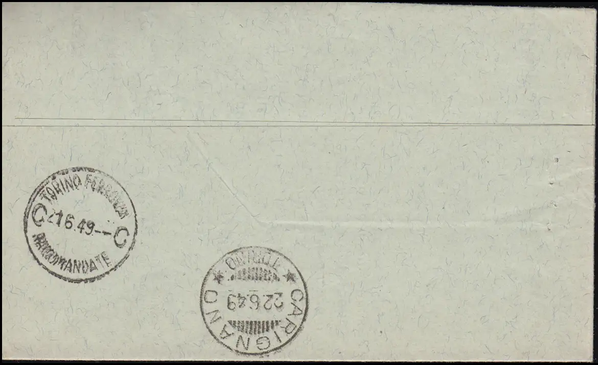 Document de l'hôpital pédiatrique de la reine Margherita (Ospedale Infantile Regina Margherita) à Turin en recommandé TORONO RECOMMANDATE 21.6.49 selon CARIGNANO 22.6.59 N° de catalogue: 774+767 Examen: original Référence produit: 00000000010958