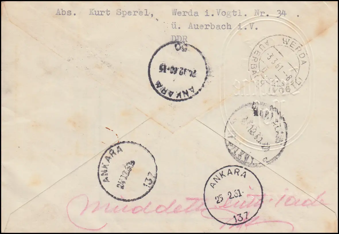 Lettre internationale recommandée en Turquie et retour autocollant ARANILMAMIS, timbre d'arrivée ANKARA 24.12.60 et Retour 25.2.61 vers WERDA 3.3.61 Numéro de catalogue: 791-79+793-794 Vérification: original Référence produit: 000000000355494>Note: Cet article n'est disponible qu'une seule fois. Vous recevrez exactement l'article représenté.