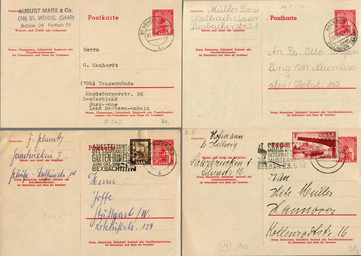 7x P34I+II entier 1950-54 St. Wendel, Nalbach, Sarrebruck, Eilbote/Aéroport