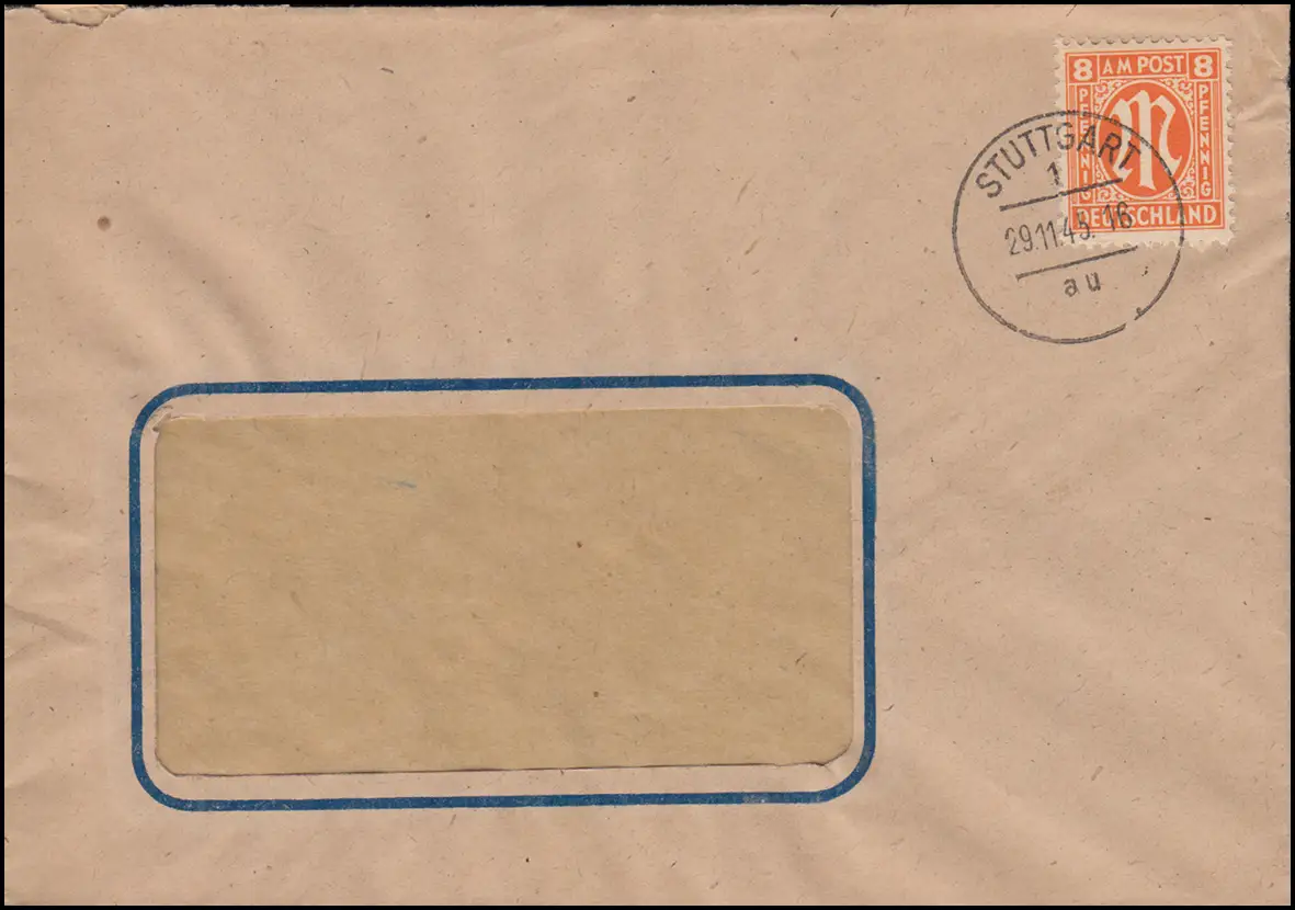 8 AM-Post 8 Pf. en tant qu'EF Lettre de fenêtre locale Société Abele Salles de secours STUTTGART 29.11.45