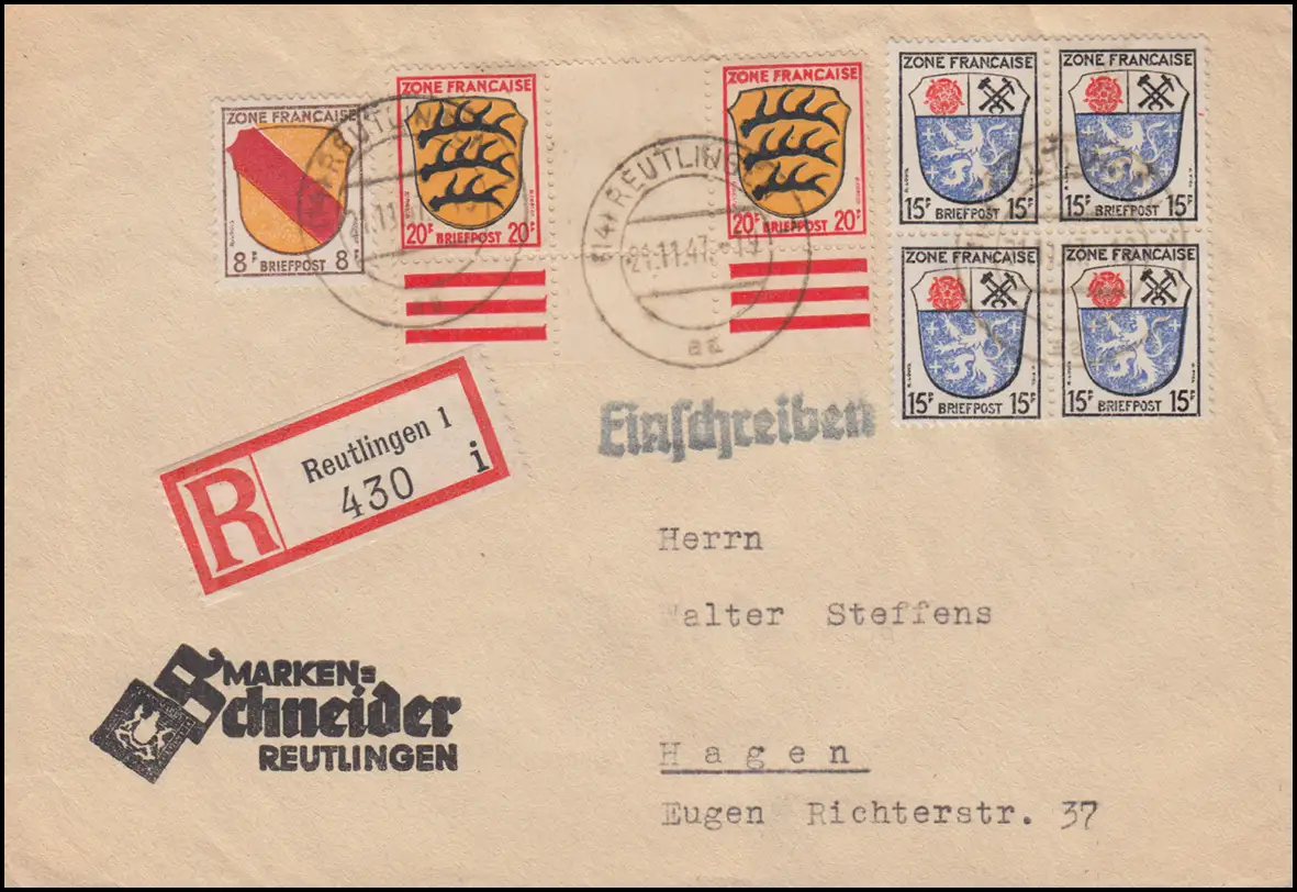 8 WZ Armoiries Paire intermédiaire avec bord + supplémentaire MiF R-Bf. REUTLINGEN 21.11.47