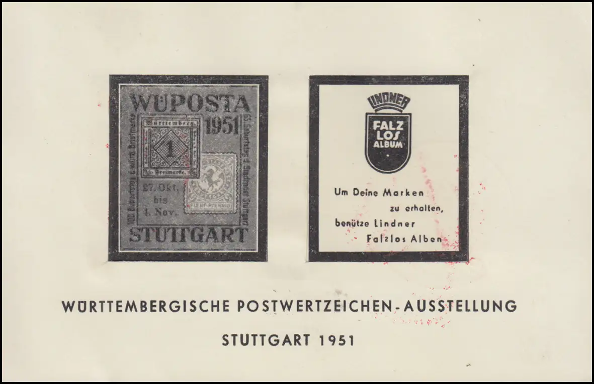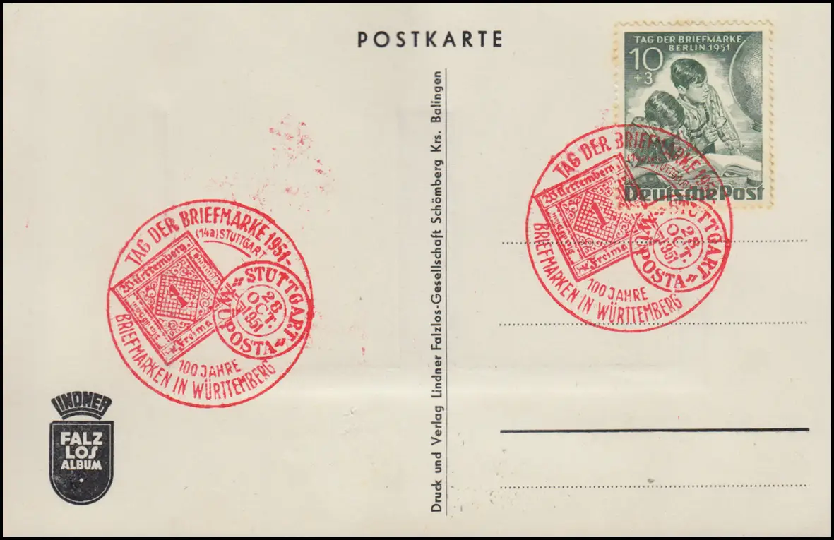 Carte postale Württembergische Postmarkt-Salon Stuttgart 1951 / Publicité Lindner Falzlos Albums Numéro de catalogue: 80 Examen: original Référence produit: 00000000022636