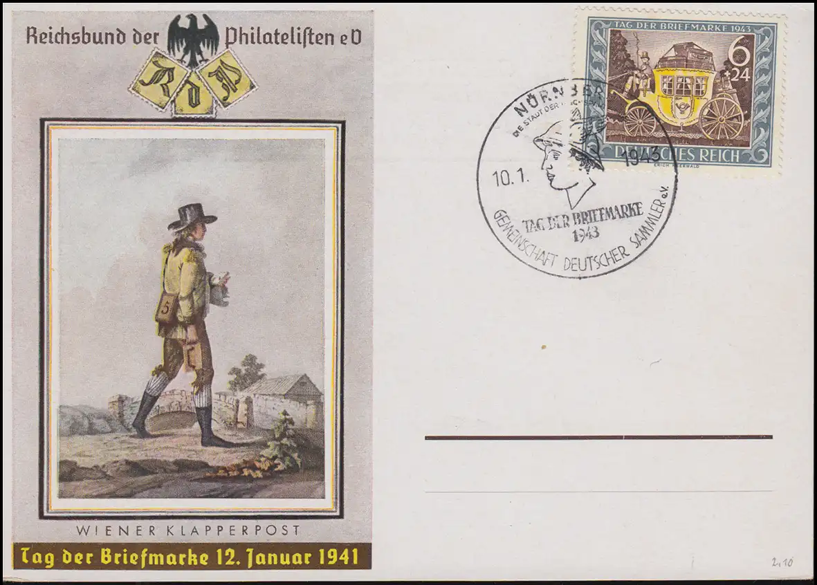 Carte postale de la Société des philatélistes du Reichsbund / Wiener Schlackerpost, cachet spécial de premier jour Hermeskopf, timbre de faveur - impression arrière Journée de l'échange de masse Nuremberg le jour du timbre 10 janvier 1943 Numéro de catalogue: 828 Examen: original Numéro d'article: 00000000034811