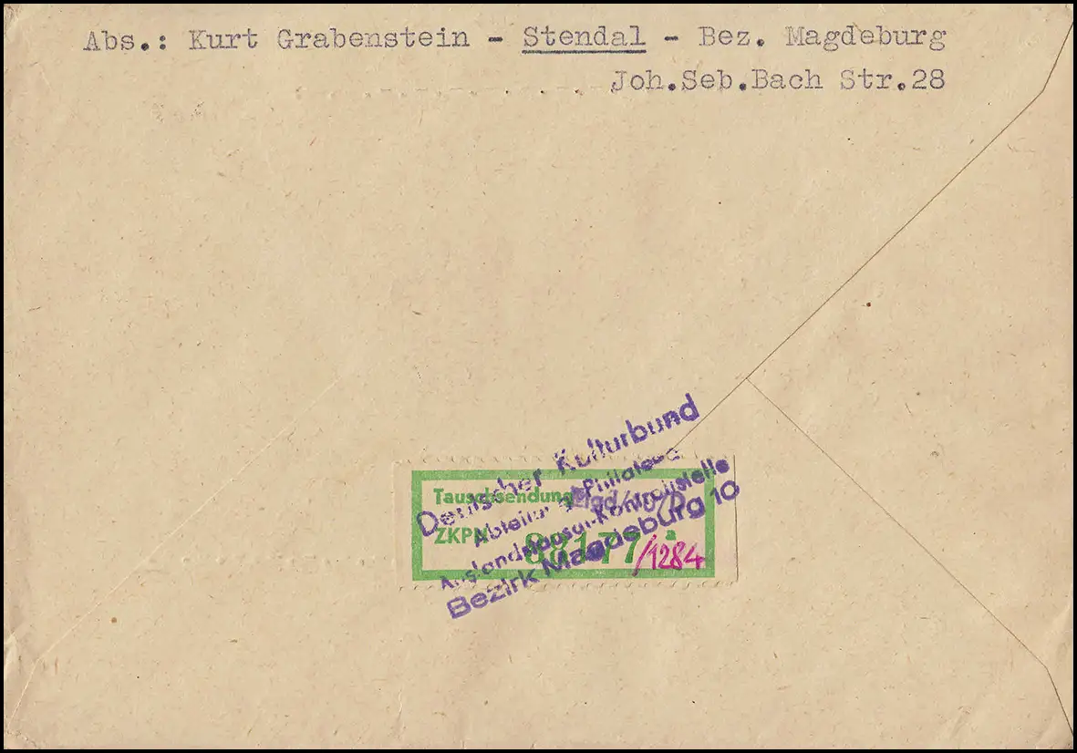 Autocollant vert arrière "Tauschbend ... / ZKPH avec numéro" et timbre "Deutscher Kulturbund / Division Philatelie / Bureau de contrôle international du district de Magdeburg 10" N° de catalogue: 847ff Vérification: original Numéro d'article: 00000000028803>p>Remarque: Cet article n'est disponible qu'une seule fois. Vous recevrez l'élément représenté avec précision.
