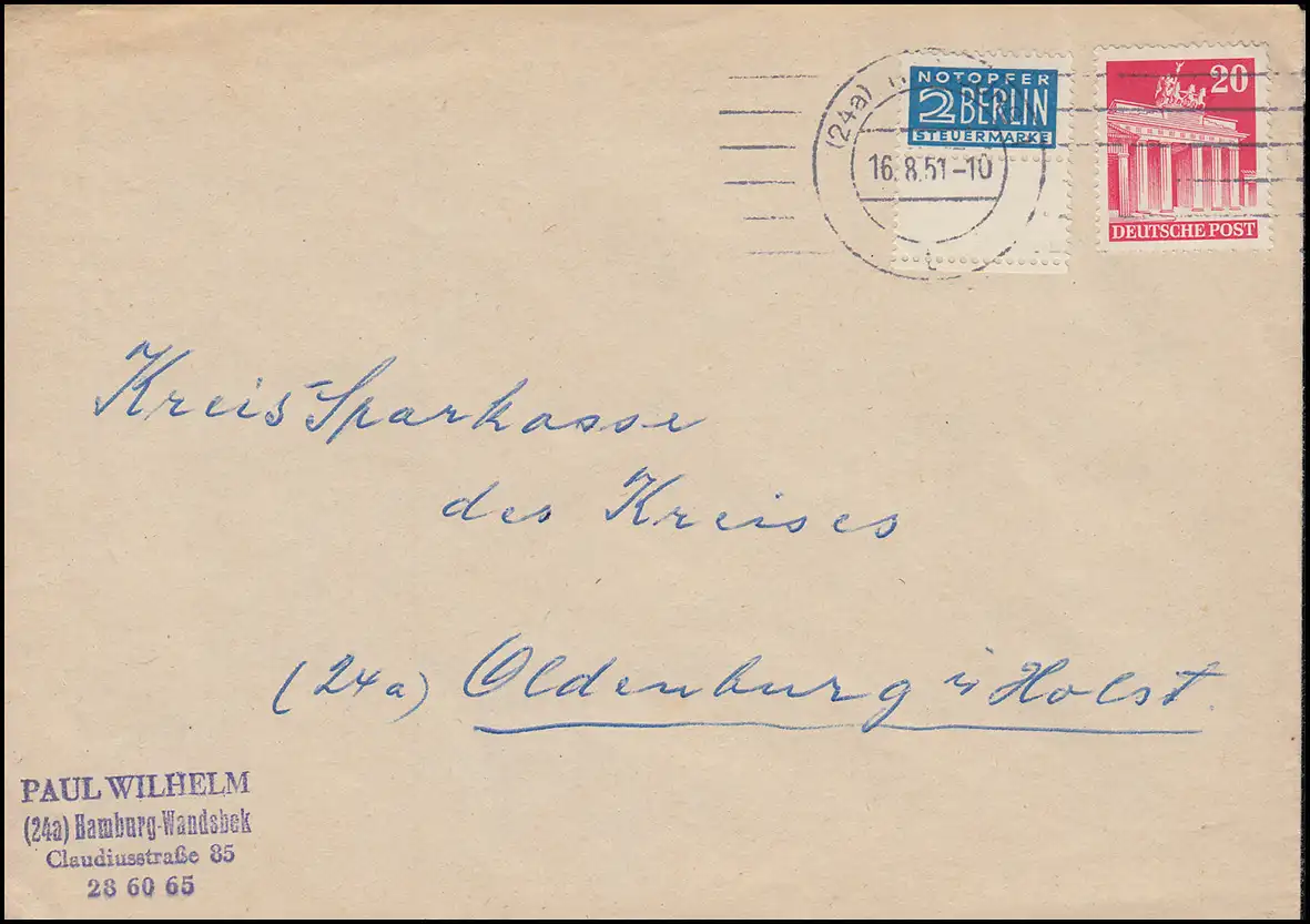 85eg Constructions 20 Pf. rouge EF avec pièce de secours avec champ de vision HAMBURG 16.8.51