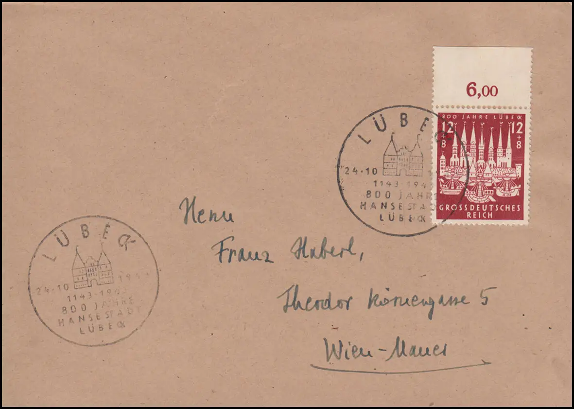 862 Hansestadt de Lubeck von Oberrand, EF sur FDC ESSt LÜBECK 24.10.43 à Vienne