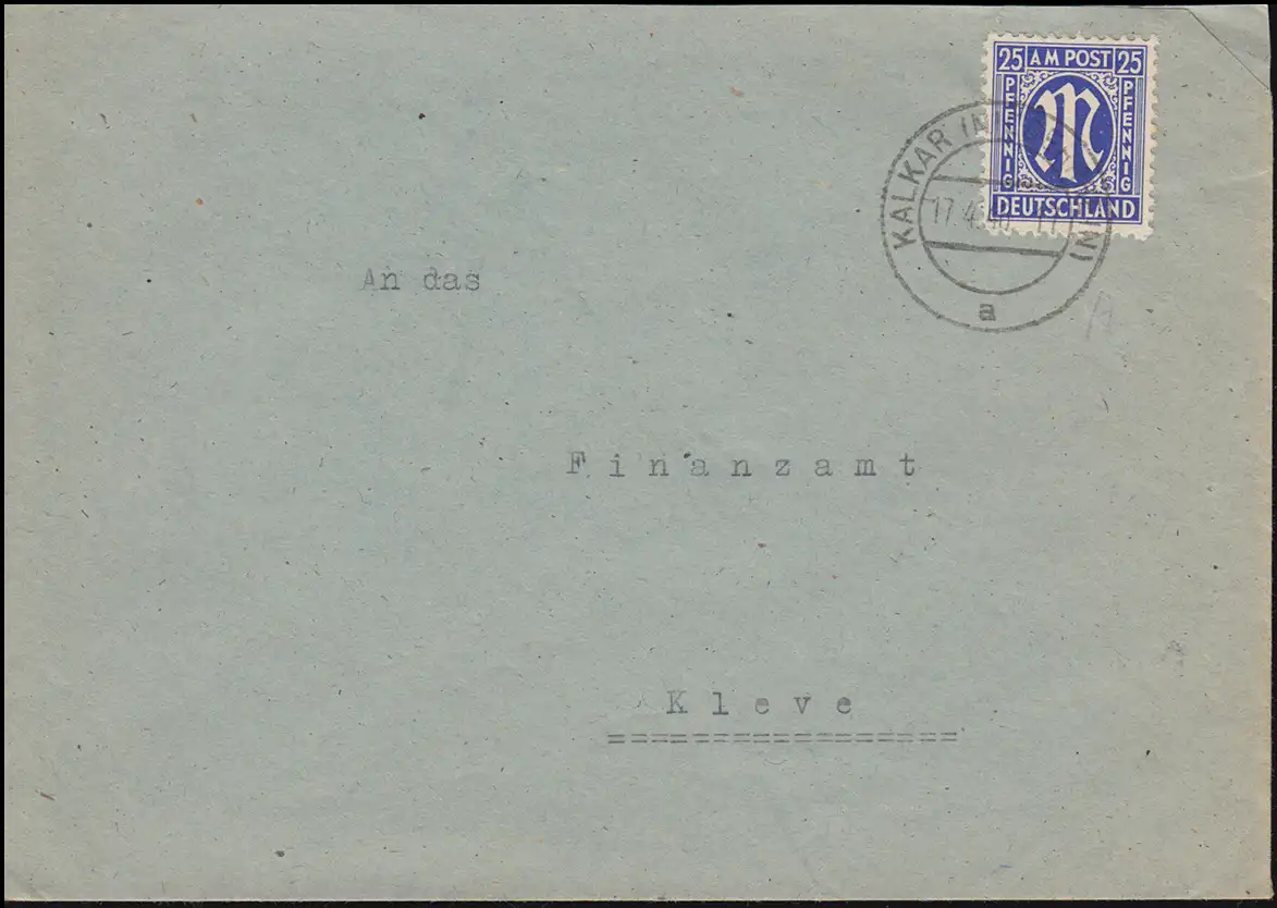 9 AM-Post 25 p. sur lettre de KALKAR (NIEDERRHEIN) 17.4.46 vers Kleve