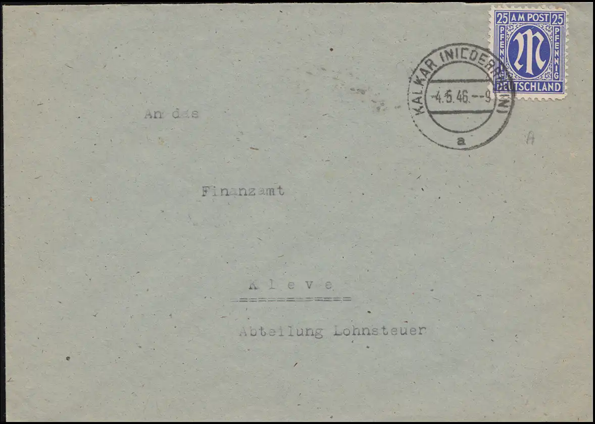 9 AM-Post 25 p. sur lettre de KALKAR (NIEDERRHEIN) 4.5..46 vers Kleve Finanzamt