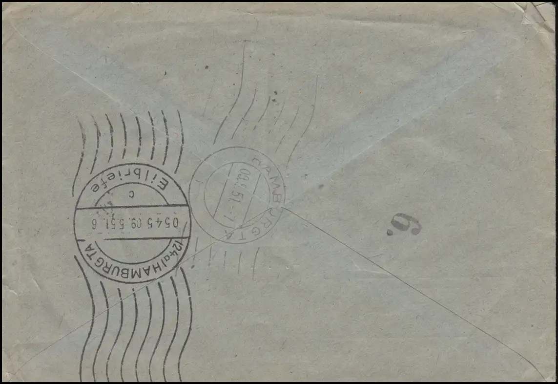 au département spécialisé en poudre de glaces alimentaires de l'Association allemande de confiserie à Hambourg: timbre d'arrivée surdimensionné "HAMBURG Eilbriefe 0545 9.5.51 6," couverture pliée Numéro de catalogue: 90eg Examen: original Référence produit: 00000000035874>Remarque: Cet article n'est disponible qu'une seule fois. Vous recevrez exactement l 'article illustré.