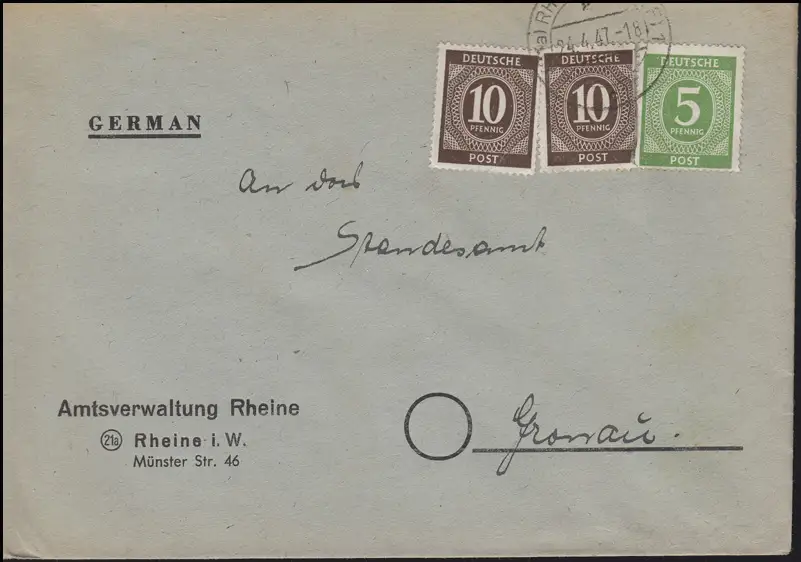 915+918 chiffres 5 + 2x10 pf MiF Administration administrative RHEINE/WESTF. 24.4.47 vers Gronau