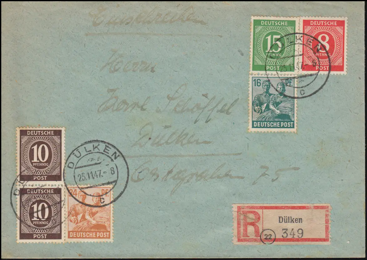 917ff Conseil de contrôle I+II chiffres et ouvriers sur lettre R locale DÜLKEN 25.11.1947
