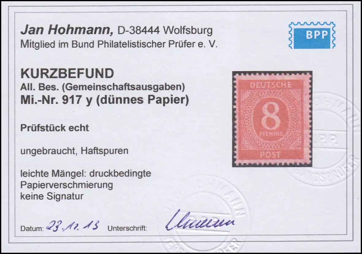 917y chiffre 8 Pf papier mince, traces d'adhérence légères, photos obtenues Hohmann BPP
