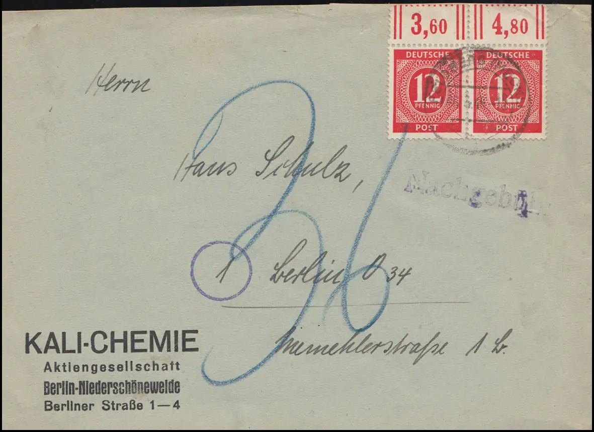 919 Paragraphe 12 Pf OR-Paar dgz sur lettre FELDBERG (MECKL.) 6.4.46 à Berlin