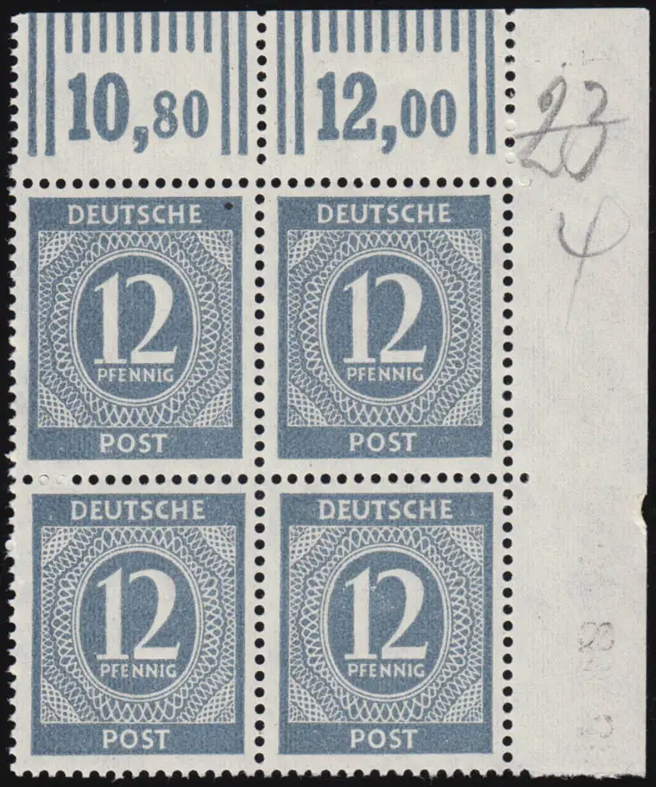 920b W OR chiffre 12 Pf 4 bloc de l'extrémité supérieure de la bobine ** non pliée couleur testée