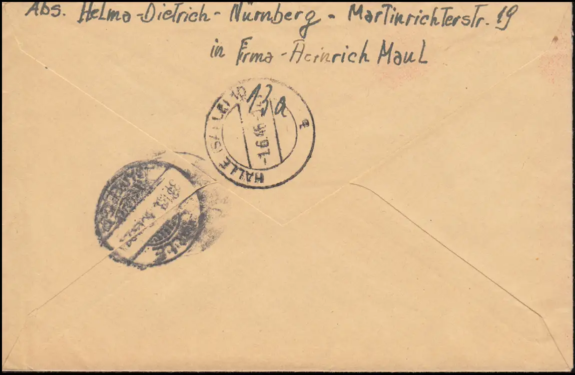 925+933 chiffres MiF R lettre de not-r-temple aptier. Tampon NÜRNBERG 2 - 23.5.46