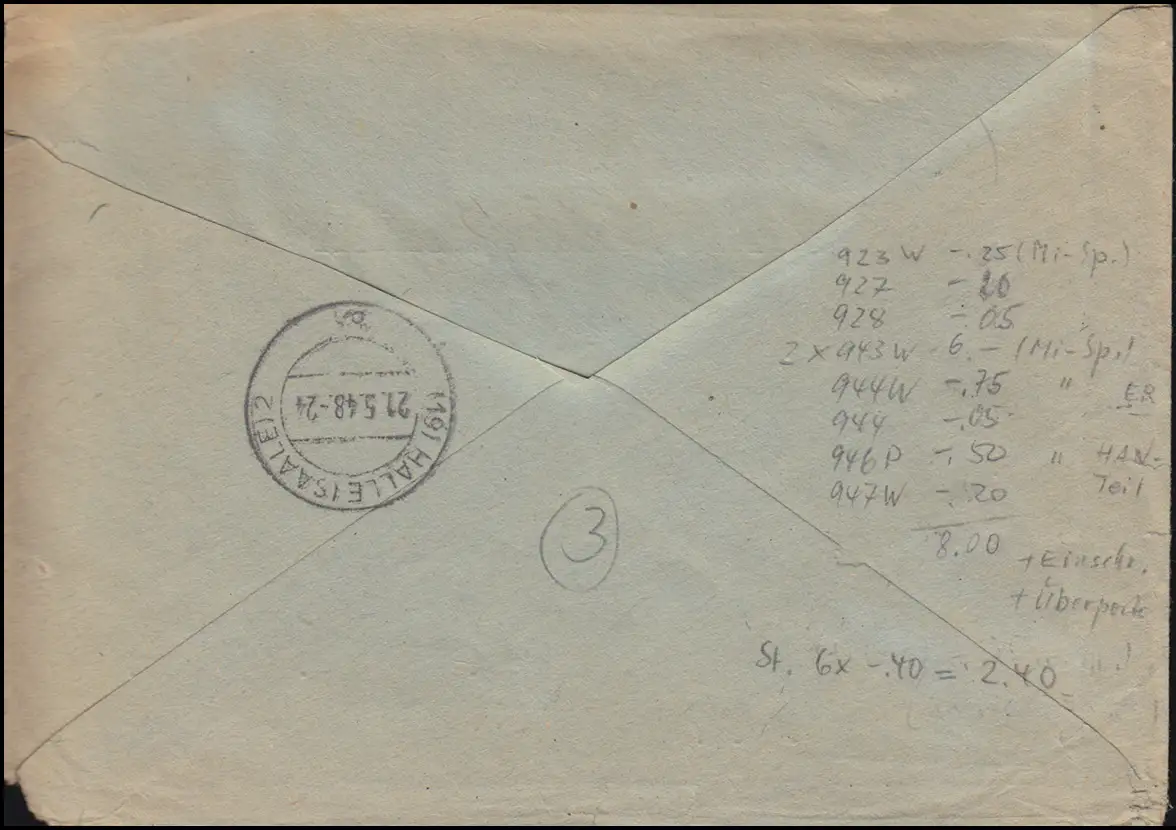 Frankature des contrôles I et II - en partie comme des bordures; entre autres 946 semeurs avec partie HAN 4098 et 944aWOR en haut à droite. Tampon d'arrivée HALLE / SAALE 21.5.48. - Enveloppe en bas à gauche et légère jaillissement selon le schéma. N° de catalogue: 927ff Vérification: original Numéro d ' article: 00000000017540>p>Note: Cet article n'est disponible qu'une seule fois. Vous recevrez exactement l'article représenté.