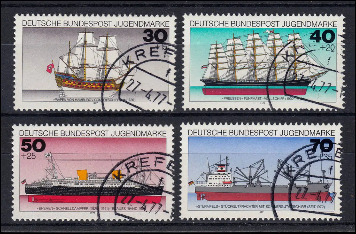 929-932 Jeunes navires allemands 1977: ensemble de timbre circulaire KREFELD 27.4.77