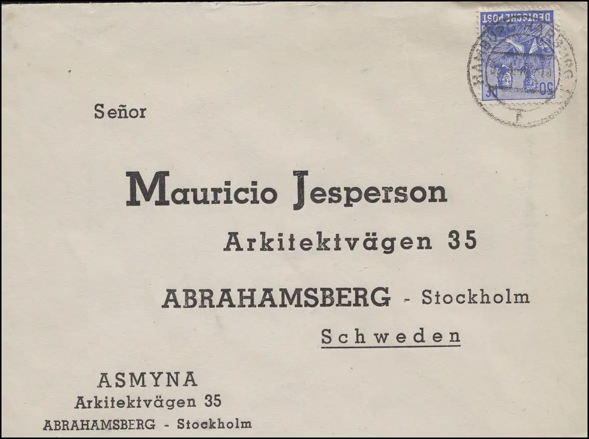 955 Conseil de contrôle II 50 Pf. Lettre HAMBURG-HERBUrg 30.4.48 vers Stockholm/Suède