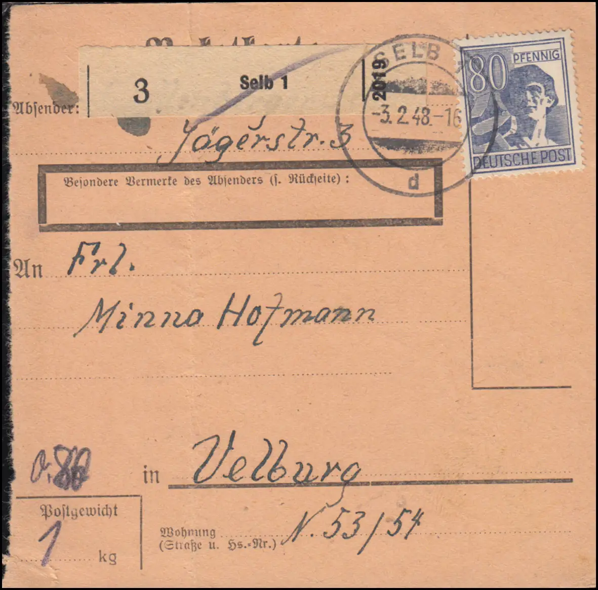 957 ouvriers 80 Pf en tant qu'EF sur carte de paquet SELB 3.2.1948 selon VELBURG 10.2.48