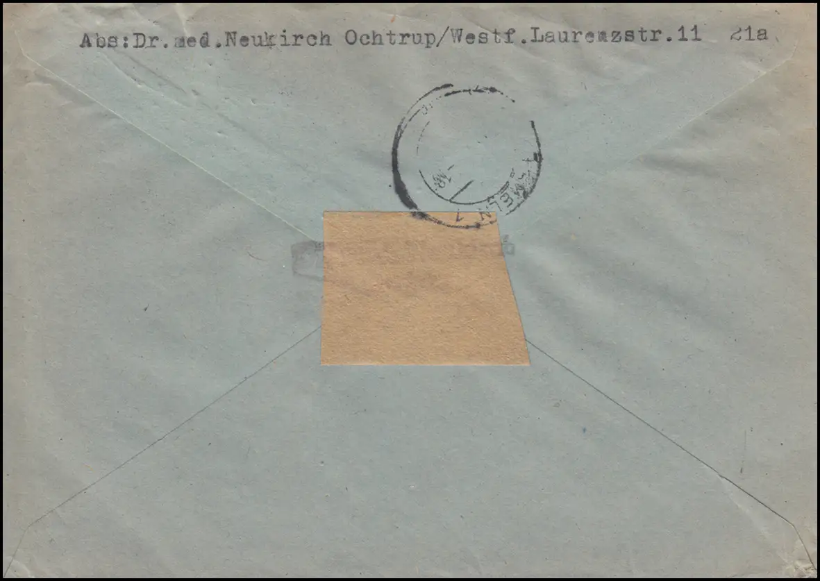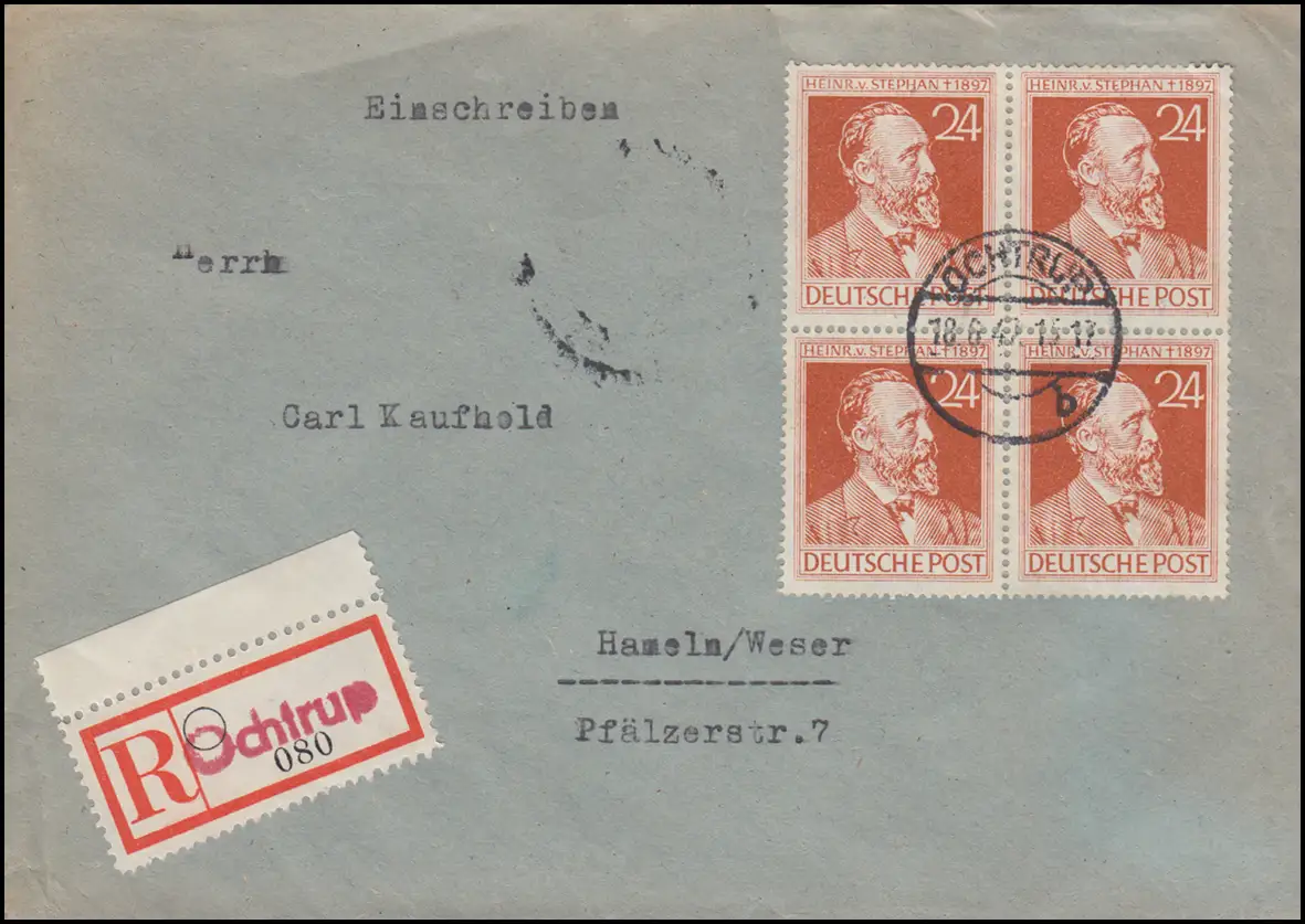 963 Heinrich von Stephan 24 Pf en tant que bloc à quatre roues sur la lettre R OCHTRUP 18.6.47
