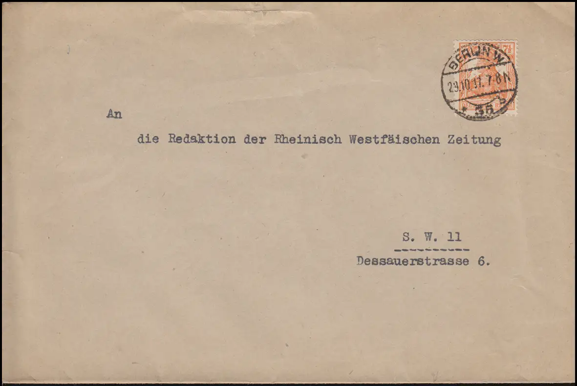 Françage individuel adapté à la vente au détail sur lettre envoyée à l'éditeur de Rheinisch Westfälische Zeitung à Berlin SW 11, cachet imprimé en arrière Numéro de catalogue: 99 Examen: original Référence produit: 00000000020421>p>Remarque: Cet article n'est disponible qu'une seule fois. Vous recevrez exactement l ' article illustré.