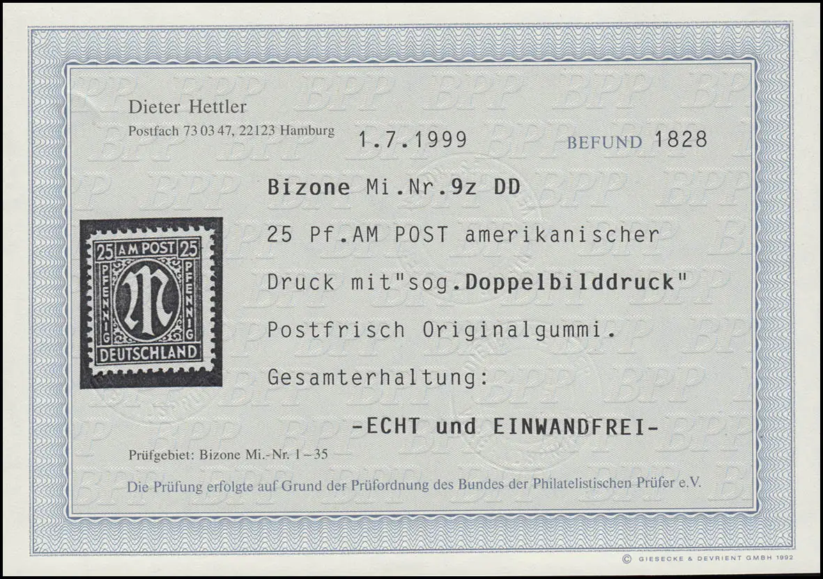 9z DD AM-Post 25 Pf double pression, résultat Hettler BPP ** postfr. impeccable