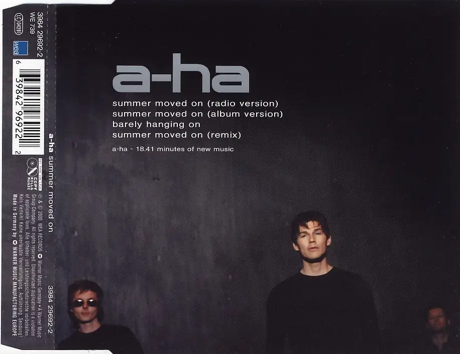 CD Single A-ha - Summer Moved On, état CD VG+ Hülle M-; Fabriqué en Allemagne 2000 WEA Records 3984-29692-2, Tracks [Radio Edit] 4:21, [Album Edite] 4-36, Barely Hanging On 3:51, _RMX] 6:00