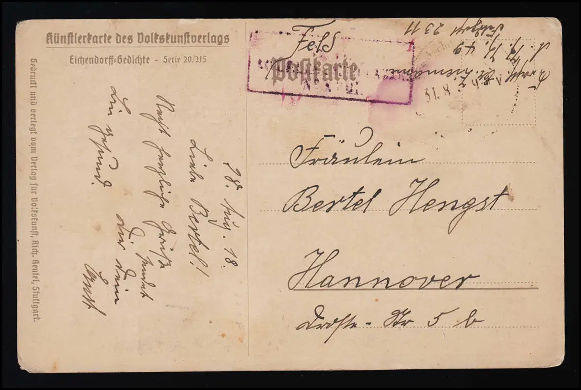 Carte des artistes de l'éditeur d'art populaire, Eichendorff poèmes Série 20/215. Editeur d ' art populaire Richard Keutel Stuttgart Examen: original Référence produit: 00000000047579