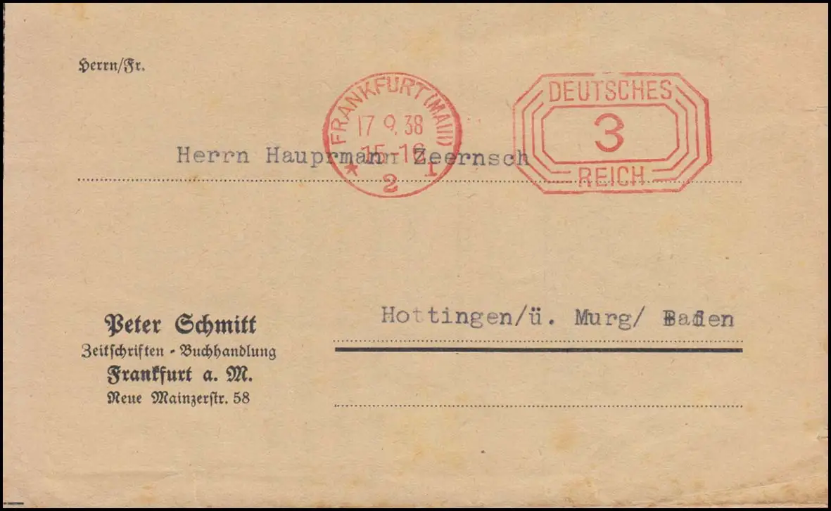AFS Frankfurt / Main 17.9.38 - 3 pfennig sur impression après Hottingen/Murg