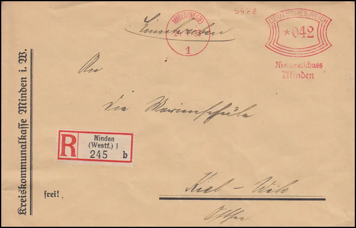 AFS Comité de district Minden 24.4.33 Kommunalkasse sur lettre R selon Kiel-Wik