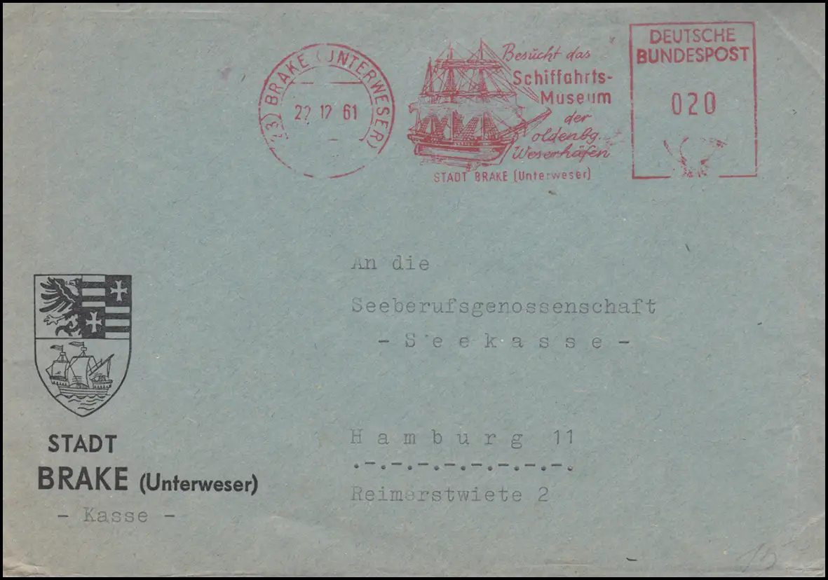 AFS Schiffe-Museum Ville de BRAKE (UNTERWESER) 22.12.61 sur lettre à Hambourg