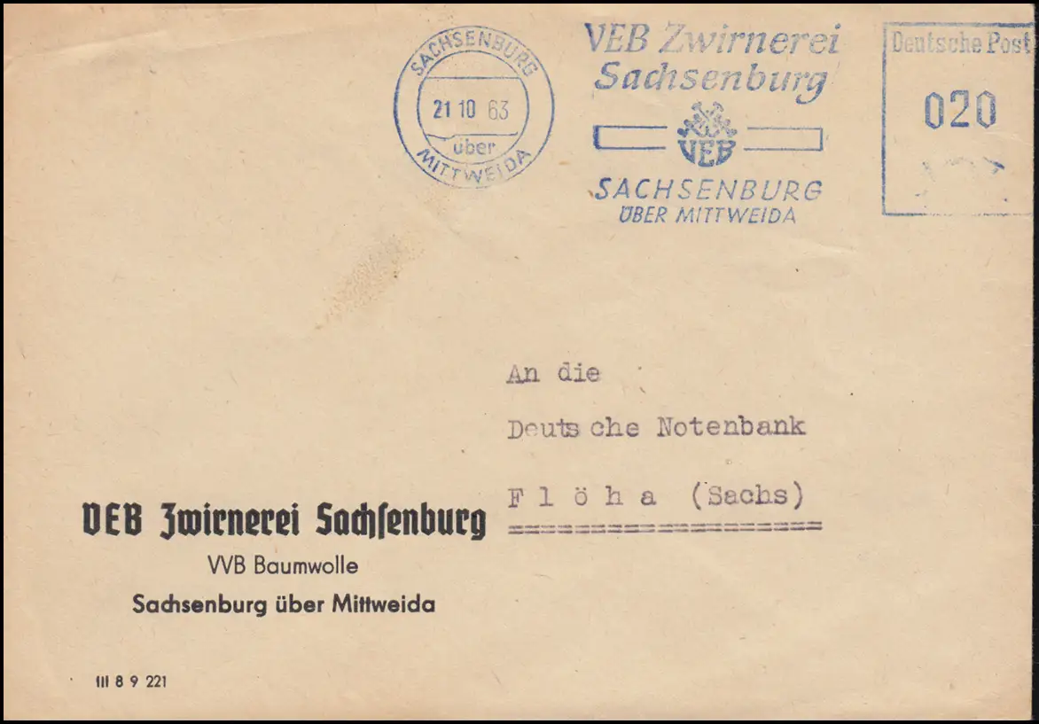 AFS VEB Zwirnei Sachsenburg 21.10.1963 Lettre à la Deutsche Notenbank Floha