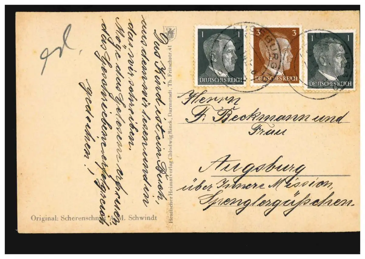 AK A.M. Sort: Oiseau sur le rameau de fleurs, AUGBURG 1943