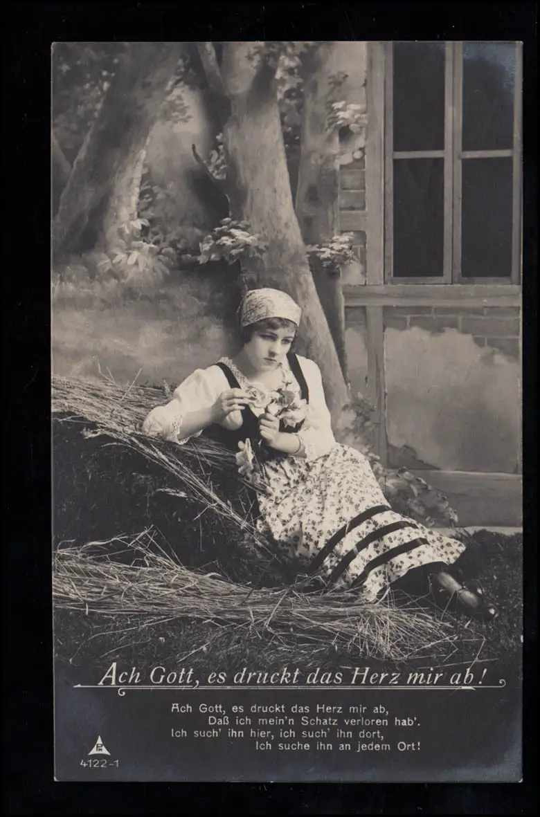 AK Amour La chance perdue - Fille triste avec des fleurs, Poste de champ 9.12.1917