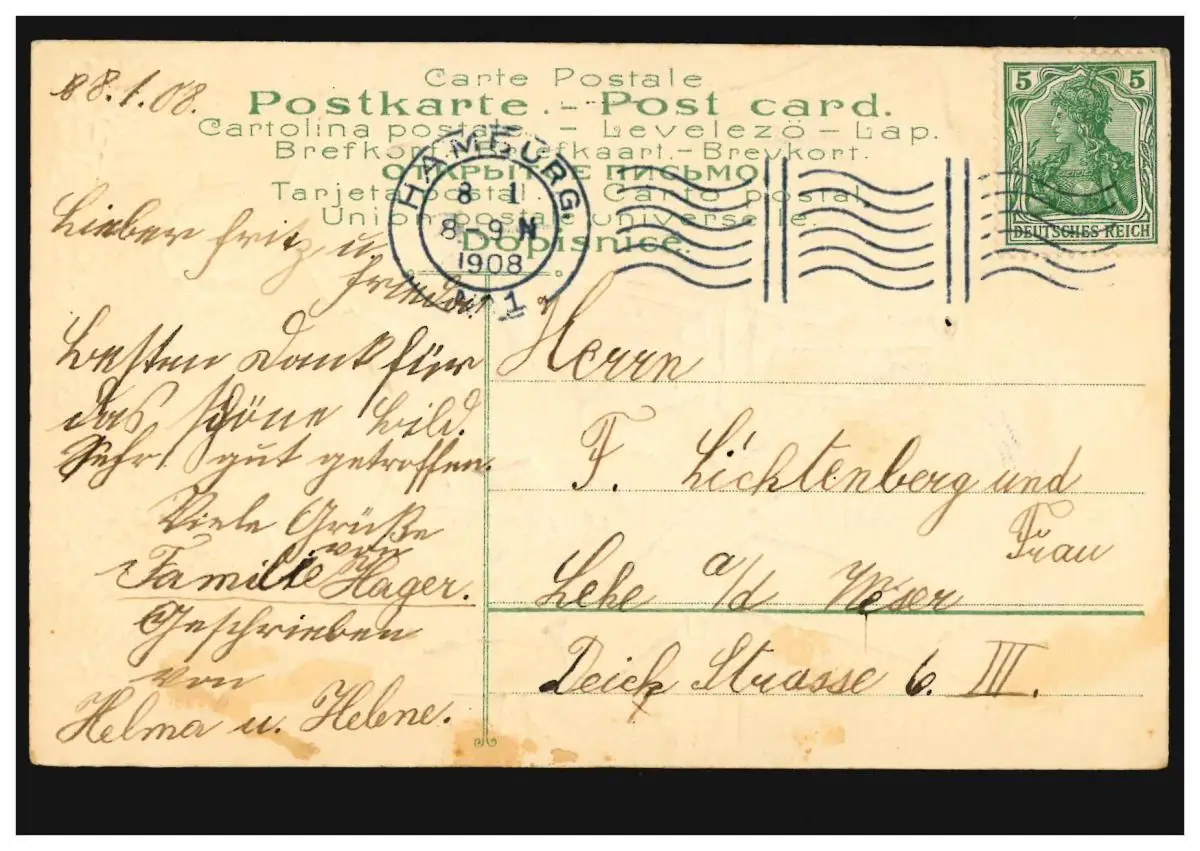 AK Amour couple avec guitare, poème: A la Weser! HAMBURG No.1 - 8.1.1908