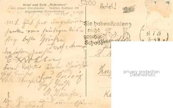 Koblenz__Rhein Panorama Hotel zum Rittersturz postalisch gelaufen 1928 Erhaltung siehe scans [WerneD78] WernPID7