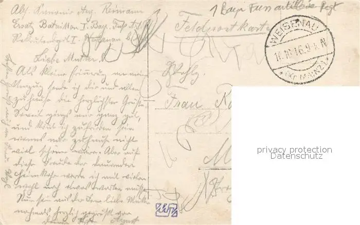 001_Regiment_Bayern_KBFar_001_Feldartillerie_Muenchen Kategorie Alte Ansichtskarten Postkarten bx37178 001_Regiment_Bayern_KBFar_001_Feldartillerie_Muenchen Weissenau Mainz Uniform postalisch gelaufen 1916 Feldpost Erhaltung siehe scans [Chrisger]