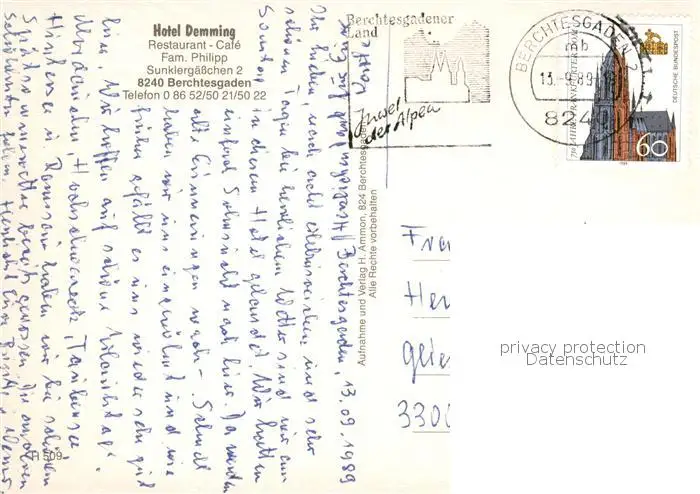 73797132 Berchtesgaden Hotel Demming Weinstuben Panorama Berchtesgaden postalisch gelaufen 1989 Erhaltung siehe scans [WerneD78] [WernPID7 ]