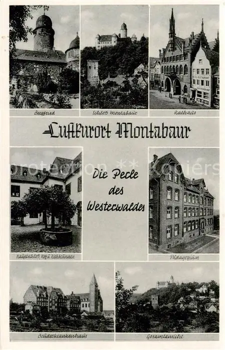 73797621 Montabaur_Westerwald Bergfried Schloss Montabaur Rathaus Hauptschloss Ziehbrunnen Bruederkrankenhaus Paedagogium Panorama Montabaur_Westerwald postalisch nicht gelaufen 1921-1965 Erhaltung siehe scans [WerneD78] [WernPID7 ]