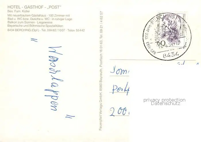 73798027 Berching Hotel Gasthof Post Berching postalisch gelaufen nach 1965 Erhaltung siehe scans [WerneD78] [WernPID7 ]