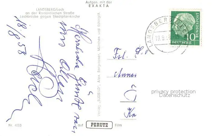 73800449 Landsberg_Lech Lechbruecke mit Stadtpfarrkirche Landsberg_Lech postalisch gelaufen 1958 Erhaltung siehe scans [WerneD78] [WernPID7 ]