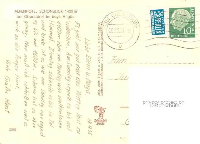 73800933 Oberstdorf Alpenhotel Schoenblick Oberstdorf postalisch gelaufen 1955 Erhaltung siehe scans [WerneD78] [WernPID7 ]