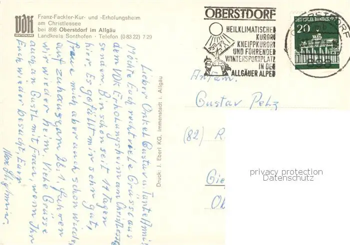 73800951 Oberstdorf Franz Fackler Kur und Erholungsheim am Christlessee Oberstdorf postalisch gelaufen 1971 Erhaltung siehe scans [WerneD78] [WernPID7 ]