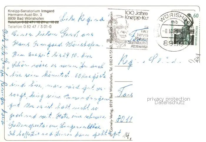 73800973 Bad_Woerishofen Kneipp Sanatorium Irmgard Bad_Woerishofen postalisch gelaufen 1989 Erhaltung siehe scans [WerneD78] [WernPID7 ]
