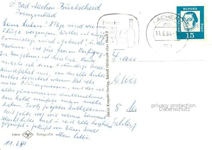 73801149 Burtscheid_Aachen St Johann Abteitor Kurgarten Prinzen und Goldmuehlenbad Brunnen Landesbad Burtscheid Aachen postalisch gelaufen 1964 Erhaltung siehe scans [WerneD78] [WernPID7 ]