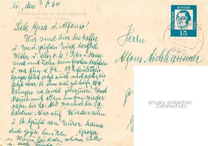 73801186 Osterreinen_Forggensee Strand Cafe Maria Fliegeraufnahme Osterreinen_Forggensee postalisch gelaufen 1964 Erhaltung siehe scans [WerneD78] [WernPID7 ]
