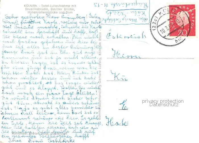 73801211 Koeln__Rhein Severinbruecke Deutzer Bruecke Hohenzollernbruecke und Dom postalisch gelaufen 1961 Fliegeraufnahme Erhaltung siehe scans [WerneD78] Fliegeraufnahme[WernPID7 ]