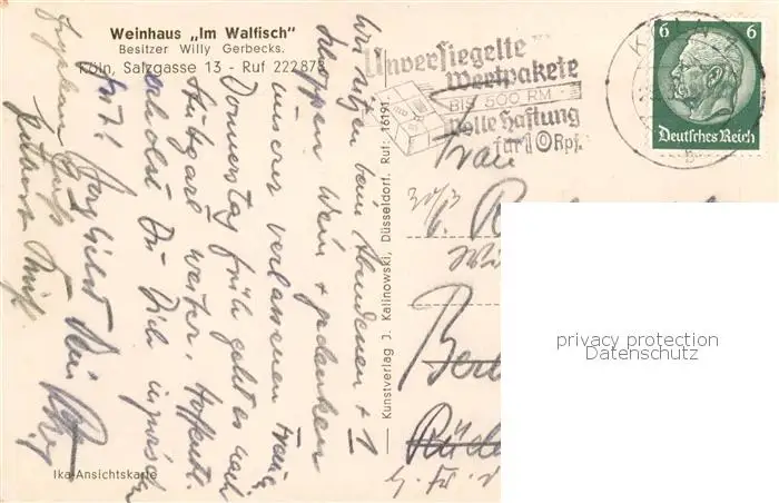 73801999 Koeln__Rhein Weinhaus Im Walfisch Gastraum postalisch gelaufen 1938 Erhaltung siehe scans [FriedD77] [Frierer ]