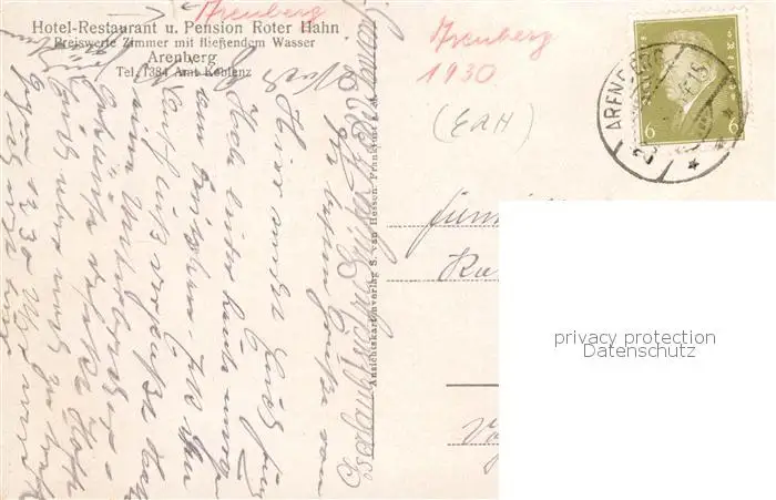 73802136 Arenberg_Koblenz Hotel Restaurant Pension Roter Hahn Arenberg_Koblenz postalisch gelaufen 1921-1965 Erhaltung siehe scans [FriedD77] [Frierer ]