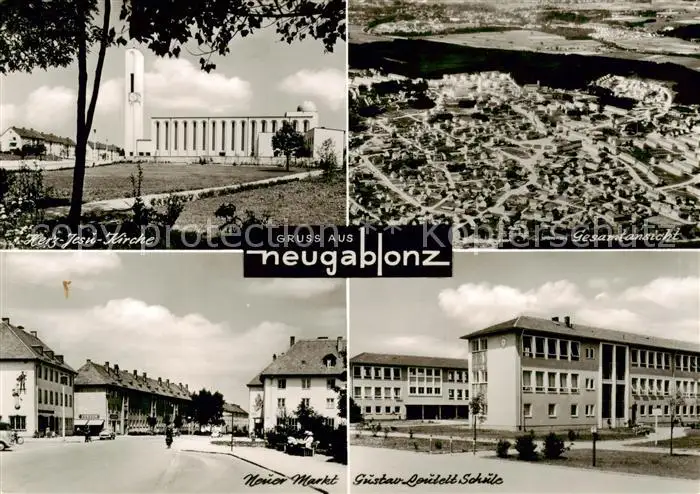 73802480 Neugablonz Herz Jesu Kirche Fliegeraufnahme Neuer Markt Gustav Leutelt Schule Neugablonz postalisch nicht gelaufen 1921-1965 Erhaltung siehe scans [FriedD77] [Frierer ]